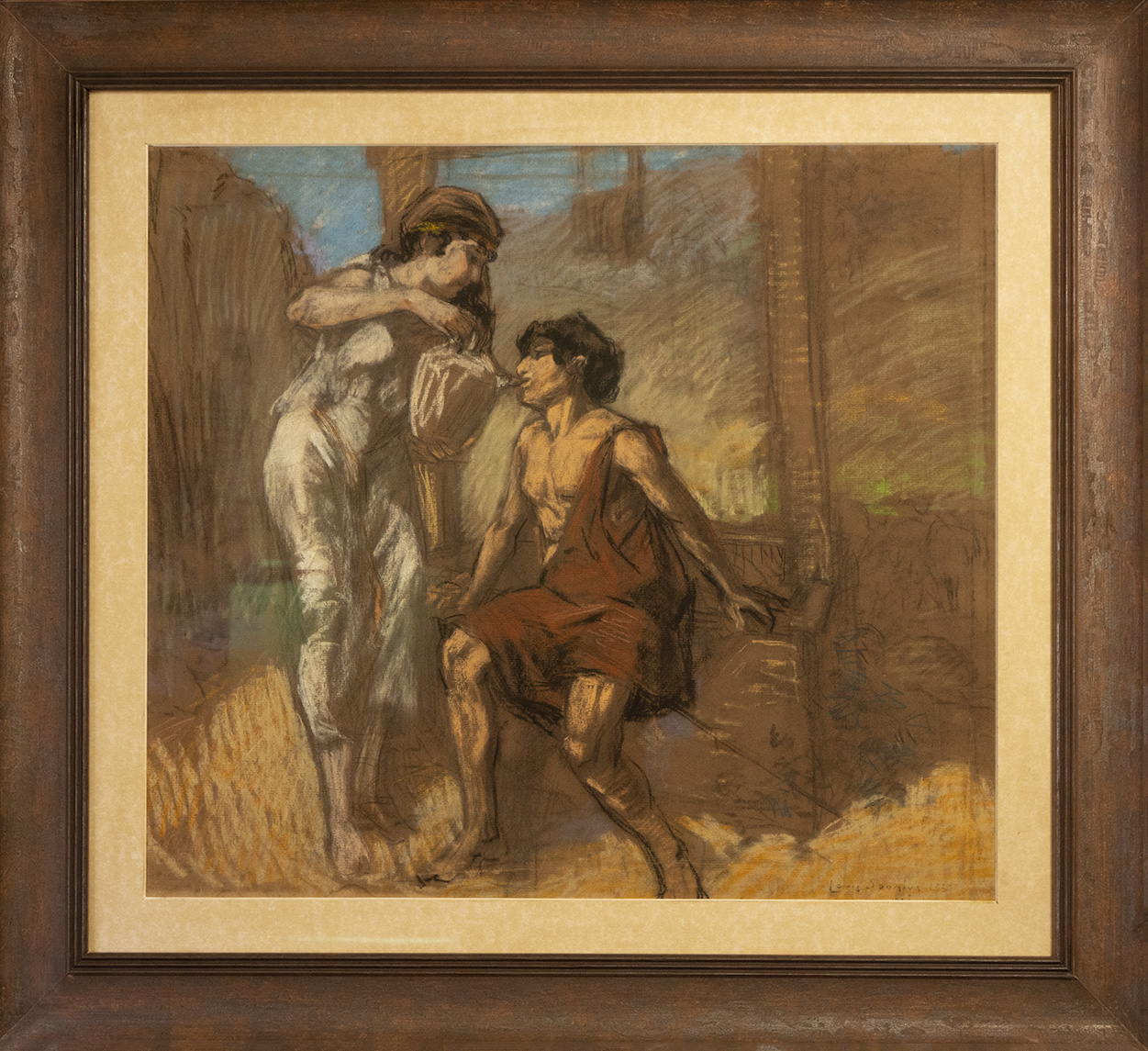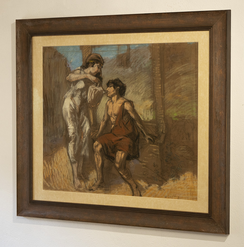 “To Quench the Thirst” (De Dorst Lessen) van Louis Soonius is een indrukwekkende pastel- en houtskoolcompositie waarin rauwe emotie samensmelt met verfijnde artistieke techniek. Het werk, vervaardigd in 1923, legt een intens menselijk moment vast, bevroren in de tijd door de trefzekere hand van Soonius.